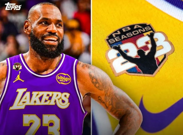 从对阵国王开始,詹姆斯球衣的右上角将固定缝制一个特殊补丁,图案内容为一个他赛前标志性的撒镁粉动作剪影,四道彩色条纹,分别代表他生涯的四个阶段。